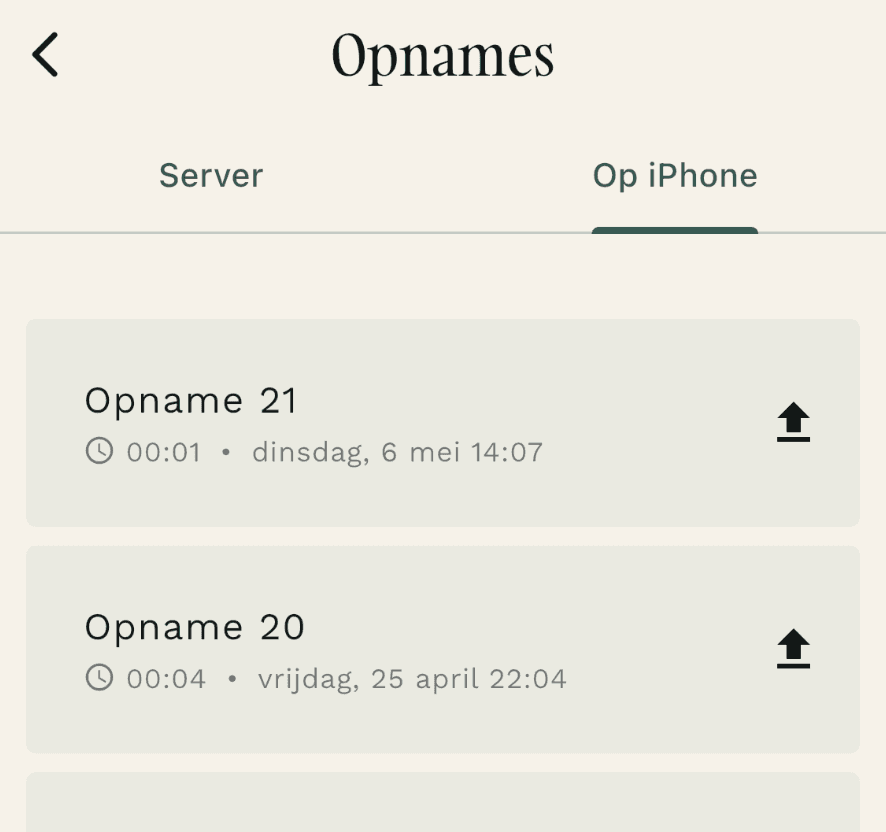 Vervolgens klik je op “op iPhone/ Telefoon” bovenin de tabjes. Je ziet daar de opnames en kunt op het “upload icoon" drukken. De opname wordt dan alsnog verzonden.