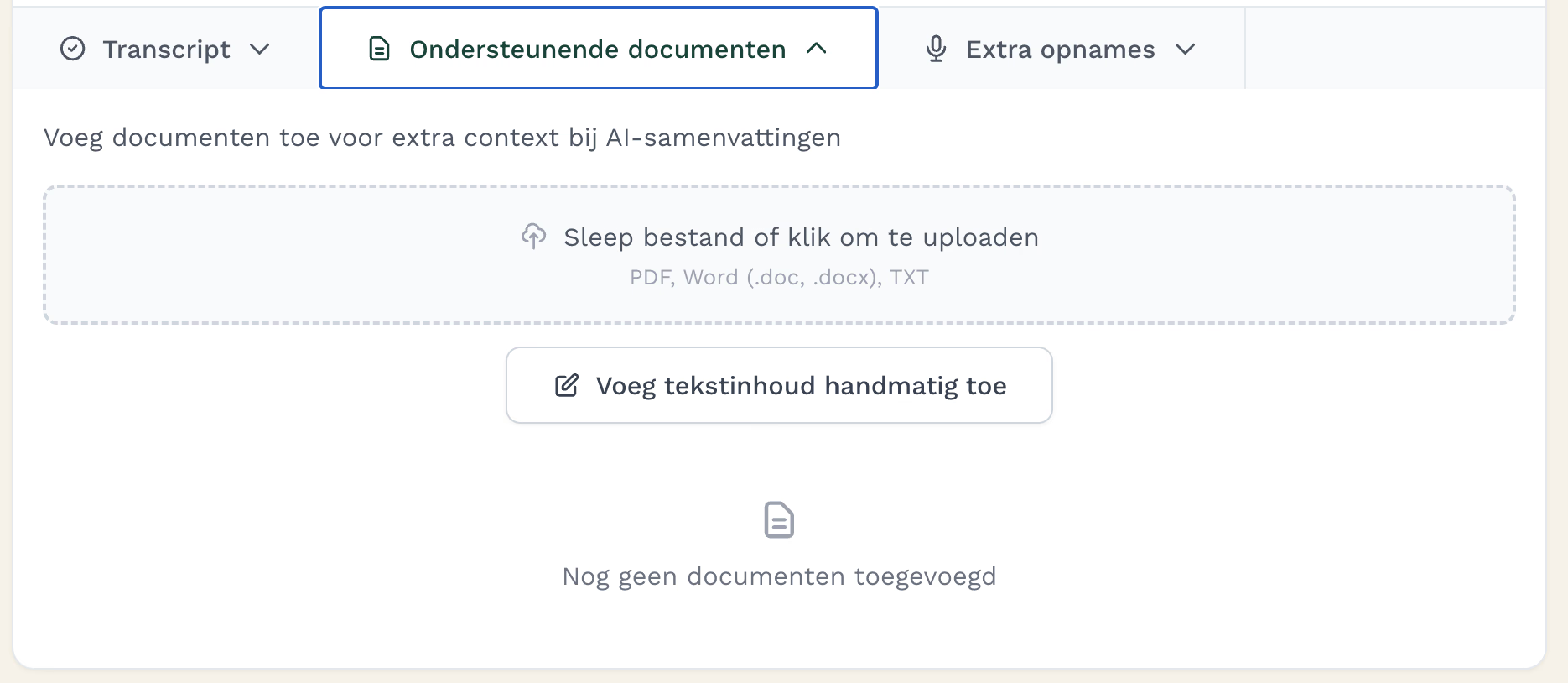 Je kunt in Notizy Web eigenlijk elk type ondersteunend document toevoegen. Denk aan een projectvoorstel, een beleidsdocument of een offerte. Alles wat relevant is voor het gesprek. Notizy gebruikt deze documenten als extra context. Zo worden je notulen inhoudelijk sterker, en haakt het verslag beter aan op wat echt belangrijk is. Bijvoorbeeld: