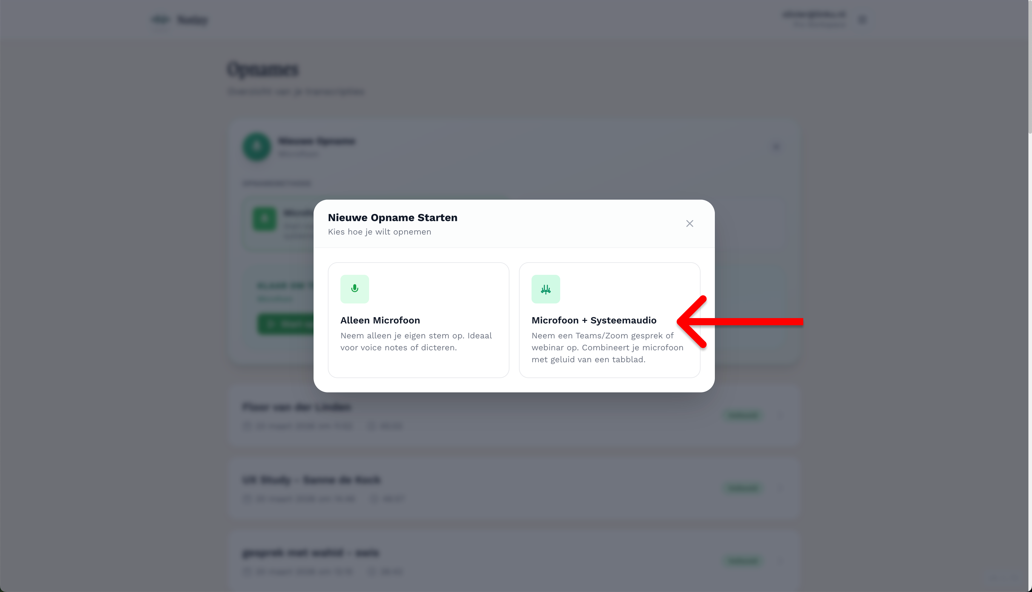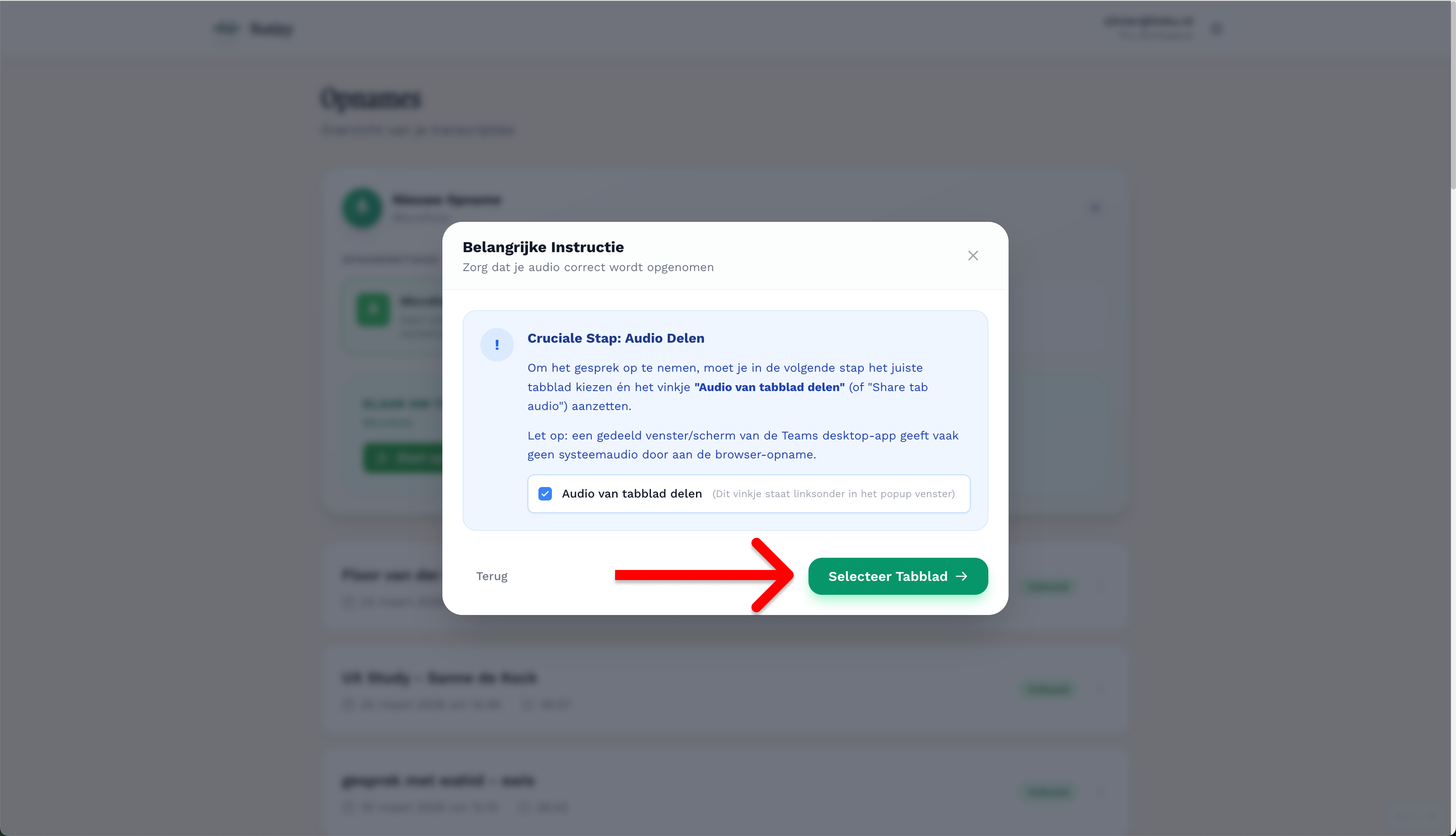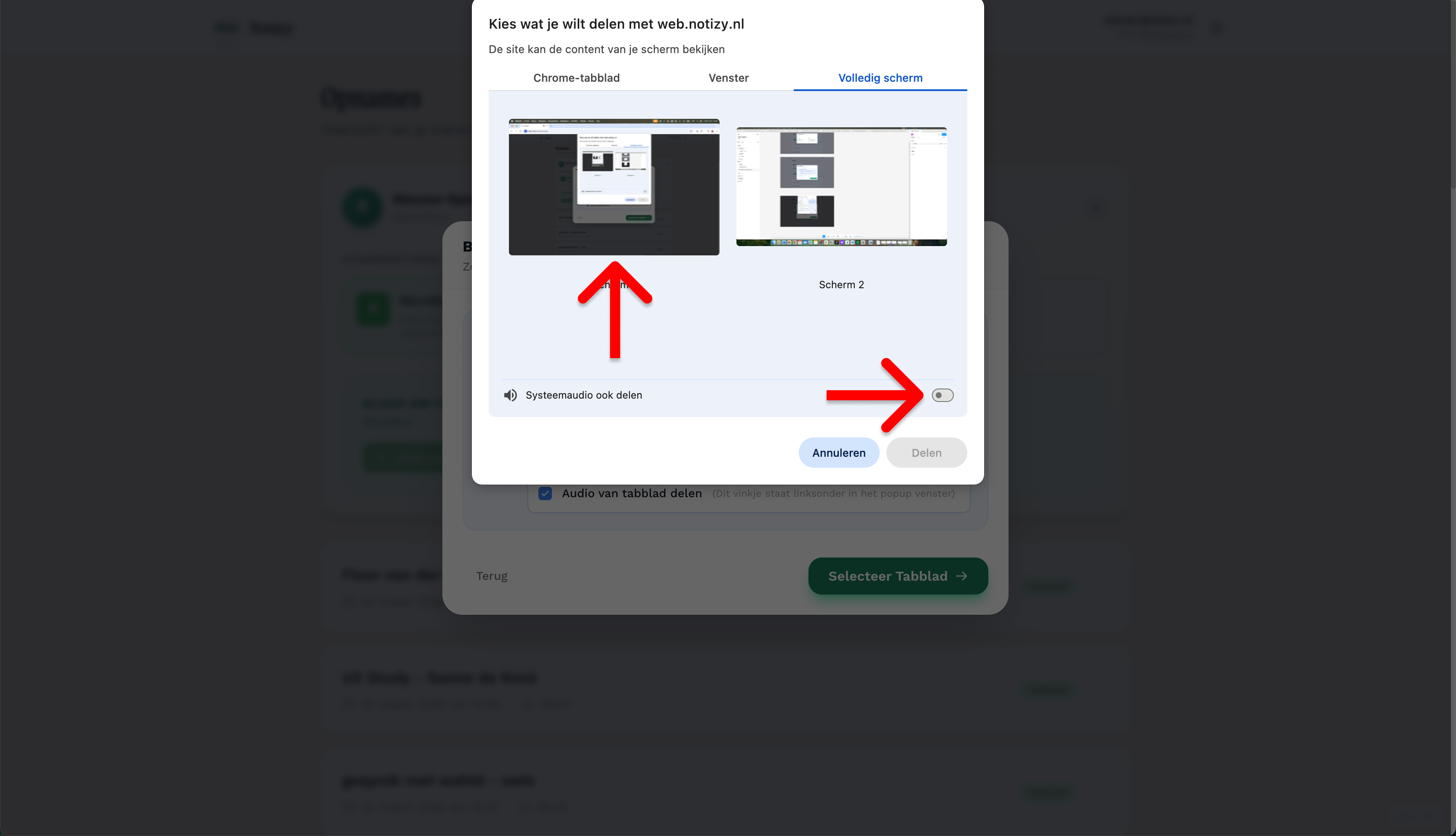 Zodra je de keuze maakt om ook de systeemaudio op te nemen, krijg je eerst een korte instructie in beeld. Notizy herinnert je er hier aan dat je in de volgende stap handmatig toestemming moet geven om het geluid van je computer te delen. Dit is een cruciale stap: zonder toestemming hoort Notizy namelijk wel jouw microfoon, maar niet de mensen met wie je in gesprek bent. Klik vervolgens op de groene knop 'Selecteer Tabblad' om de instellingen van je browser te openen en de opname definitief te starten.