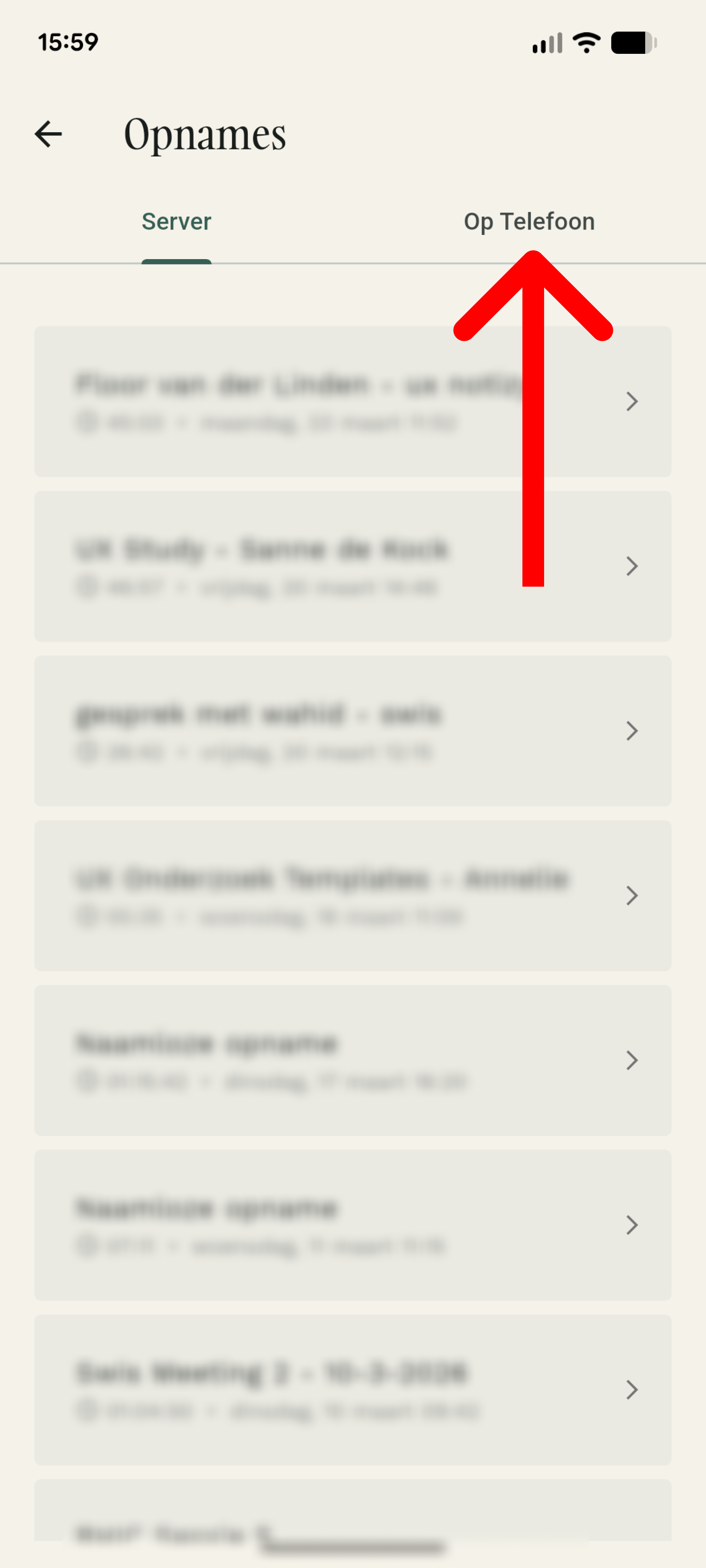 Vervolgens klik je op “op iPhone/ Telefoon” bovenin de tabjes. Je ziet daar de opnames en kunt op het “upload icoon" drukken. De opname wordt dan alsnog verzonden.
