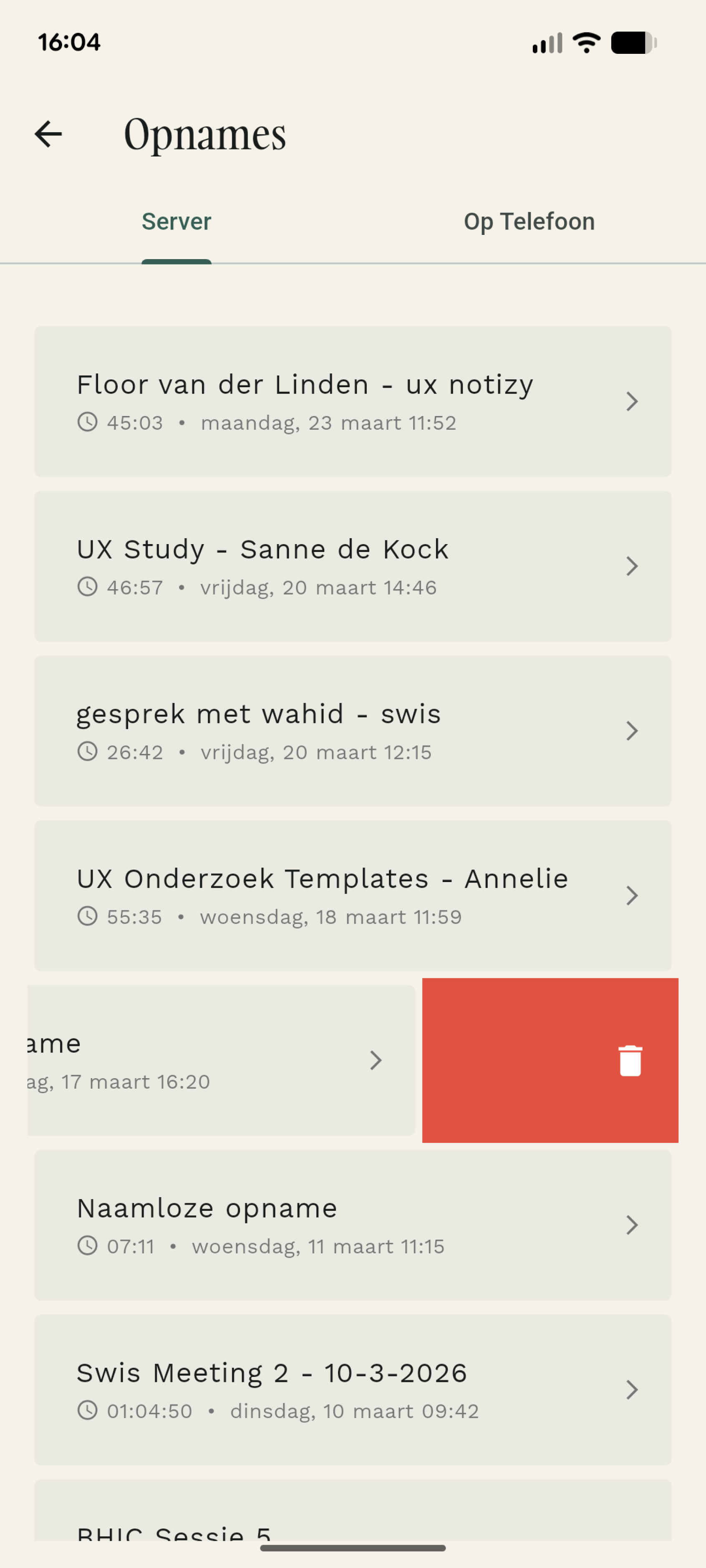 In het overzicht sleep je een opname naar links om deze te verwijderen. Na het bevestigen, is je opname verwijderd.