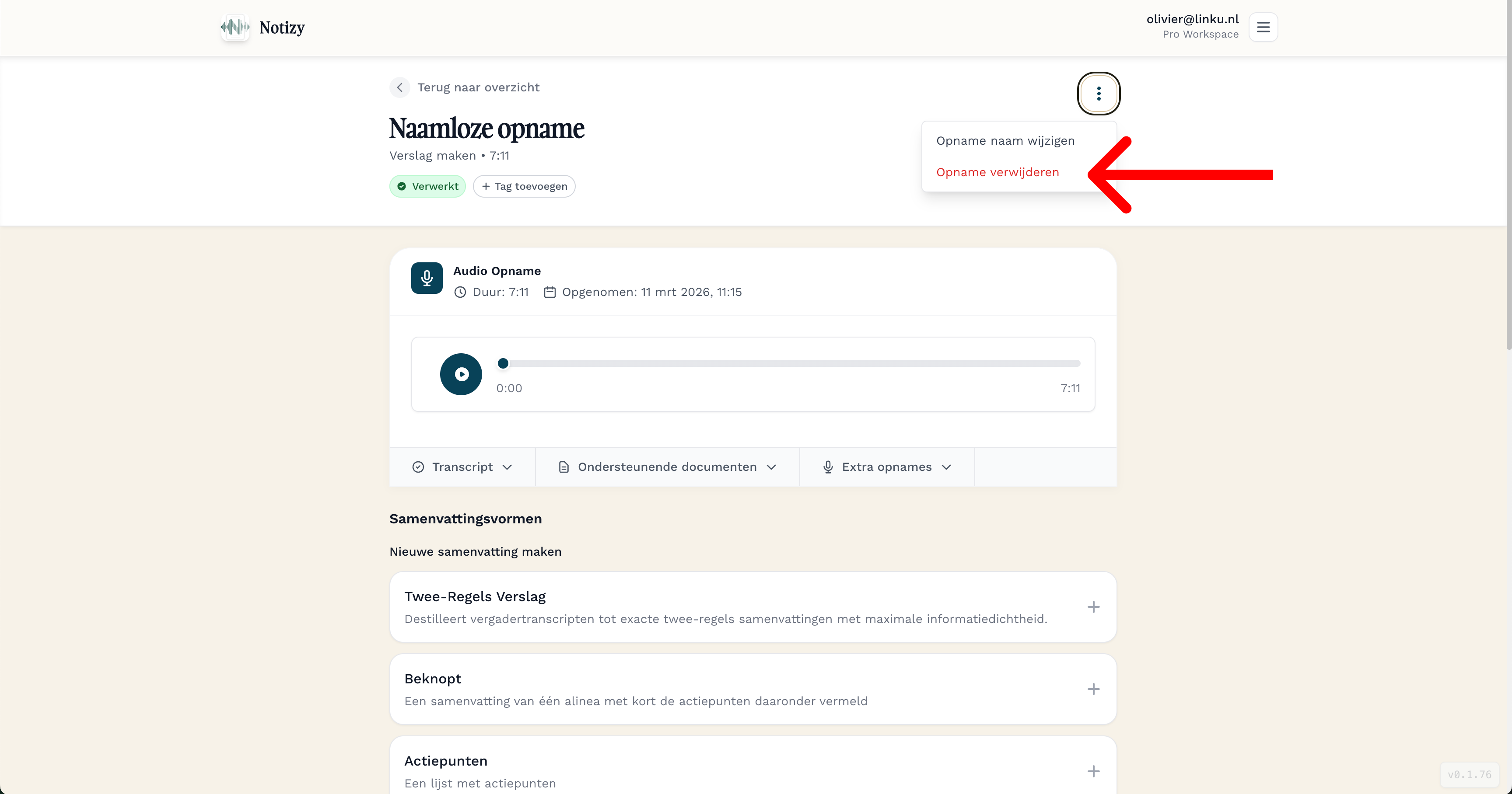 Wil je een opname verwijderen? Kies op het startscherm de opname die je wilt verwijderen. Je vindt rechtsboven in je scherm drie balletjes waarop je kan klikken om de opname te verwijderen.