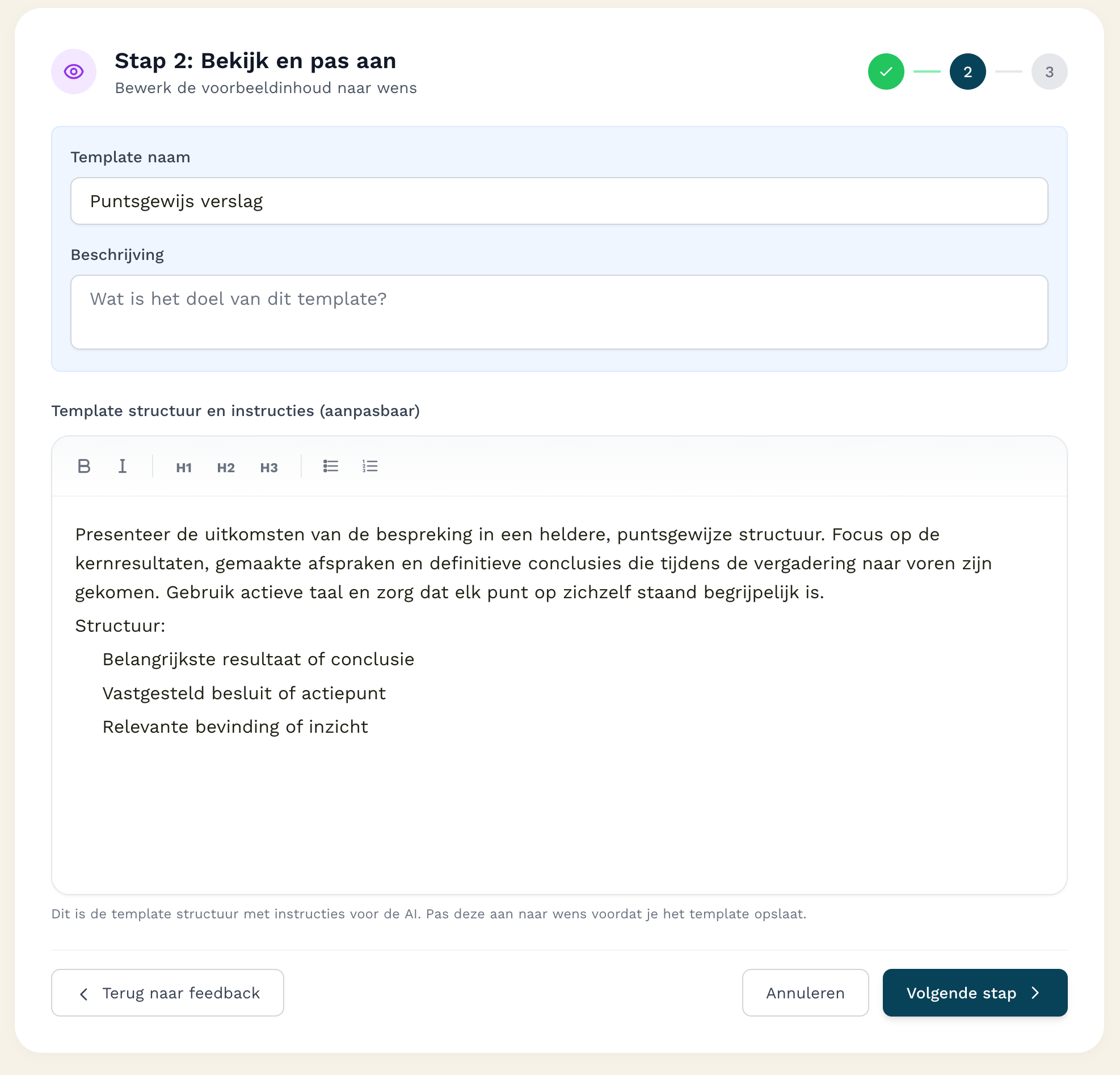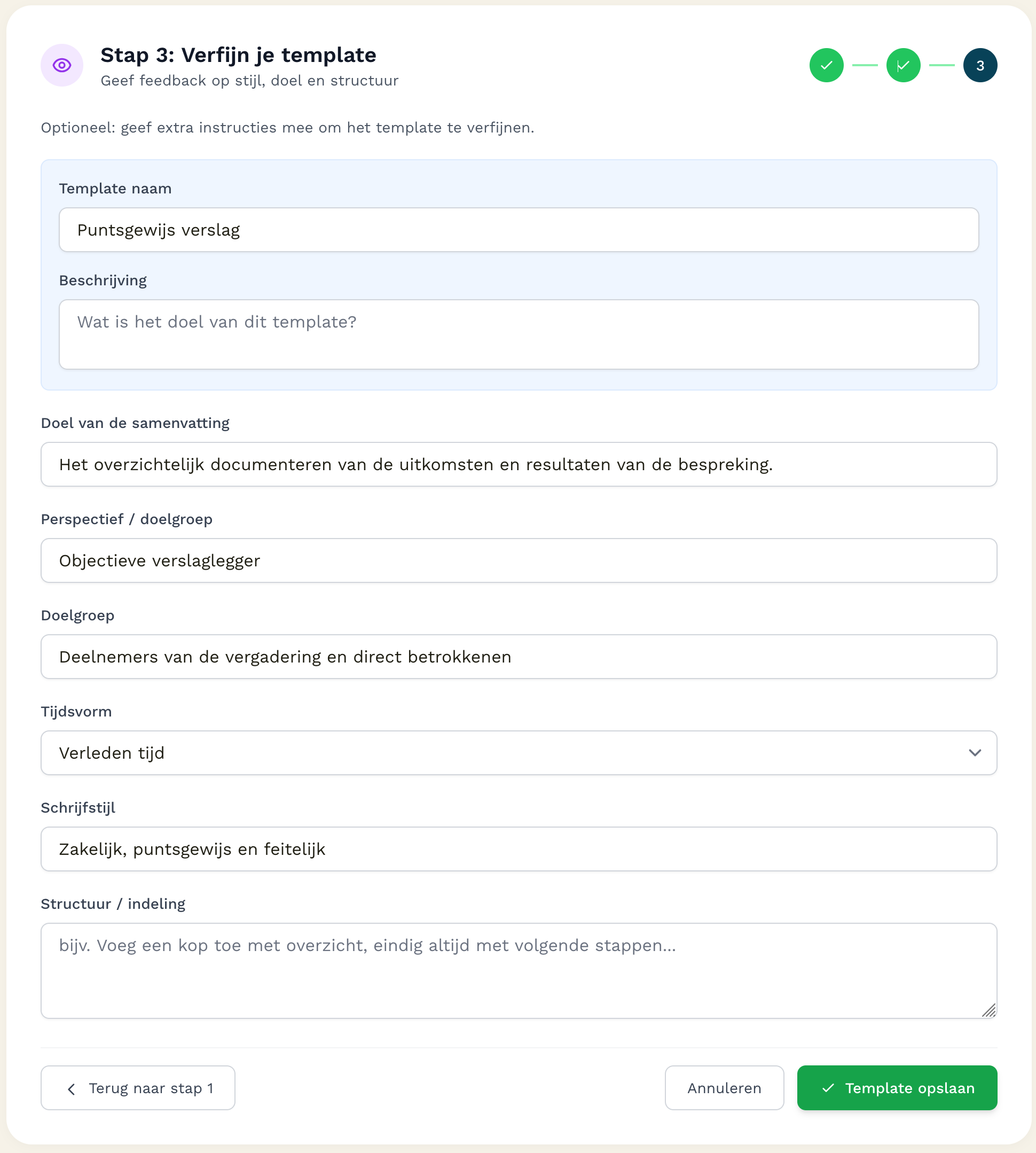 In de laatste stap kan je feedback geven op de structuur en stijl van de template.