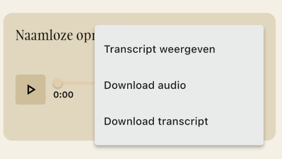 Naast het kiezen van een verslag, kun je ook je gesprek opvragen als transcript of audiobestand. Wanneer je op de drie puntjes klikt, bovenaan het scherm, heb je de optie om: