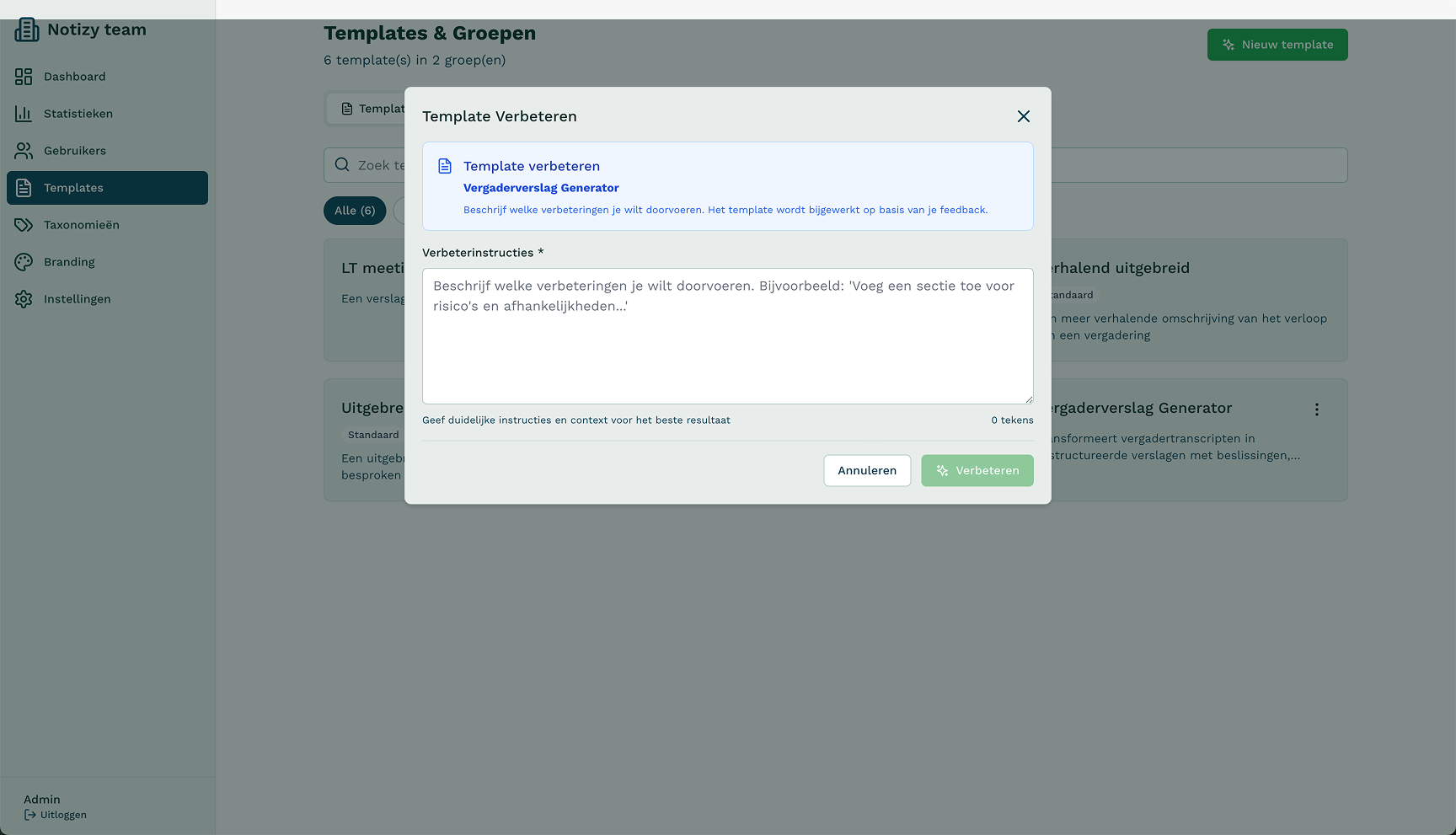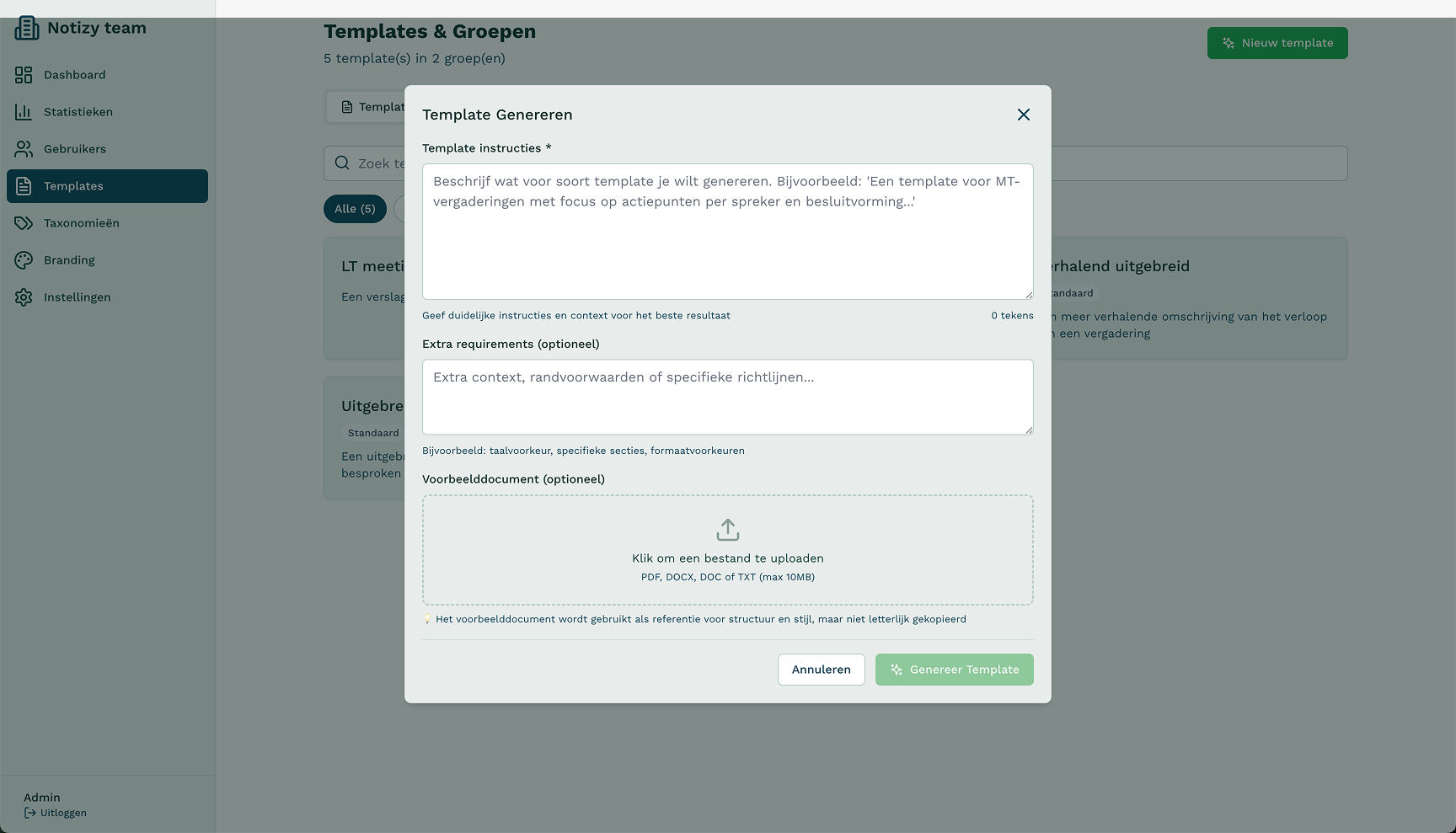 Type in het veld Template instructies de hoofdinstructies voor de AI. Bijvoorbeeld: "Maak een verslag voor MT-vergaderingen met de nadruk op actiepunten per spreker en besluitvorming."