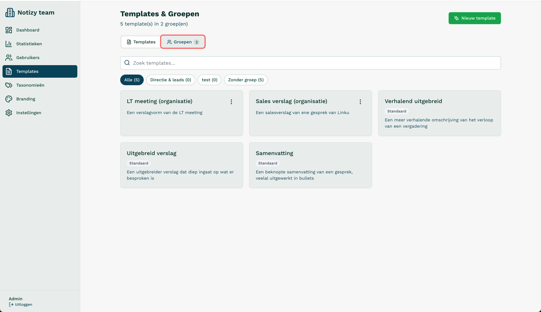 Wanneer je in het zijmenu aan de linkerkant klikt op Templates, kom je op de centrale overzichtspagina. Hier heb je direct inzicht in alle templates die beschikbaar zijn binnen je organisatie en kun je groepen beheren binnen in jouw organisatie. Groepen maken het mogelijk om templates en gebruikers slim te organiseren per team of afdeling, zodat iedereen altijd met de juiste templates werkt.
