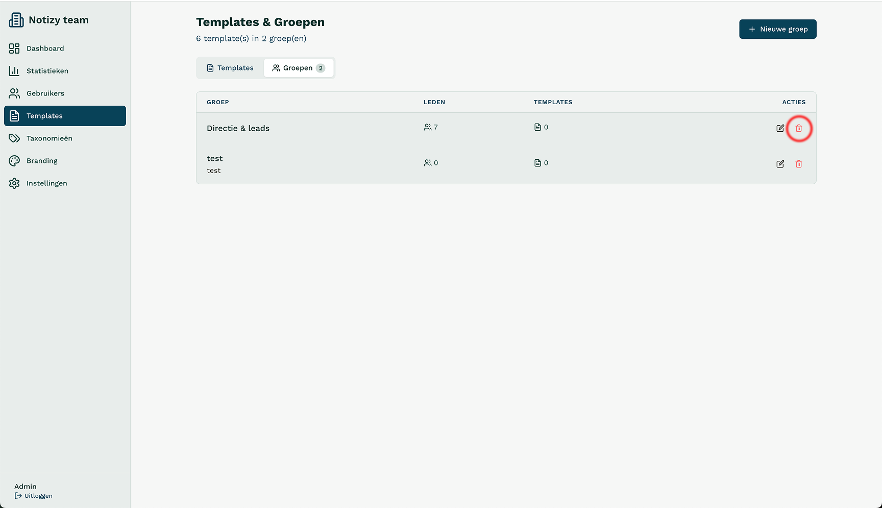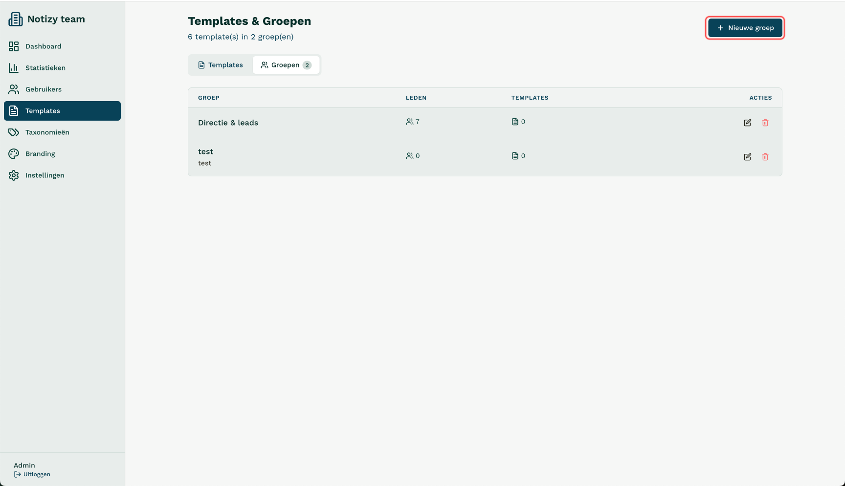 Groepen maken het mogelijk om templates en gebruikers slim te organiseren per team of afdeling, zodat iedereen altijd met de juiste templates werkt. Om met groepen aan de slag te gaan, klik je bovenaan de pagina op de tab Groepen (naast 'Templates'). Je ziet nu een overzicht van alle groepen die momenteel binnen je organisatie gedefinieerd zijn.