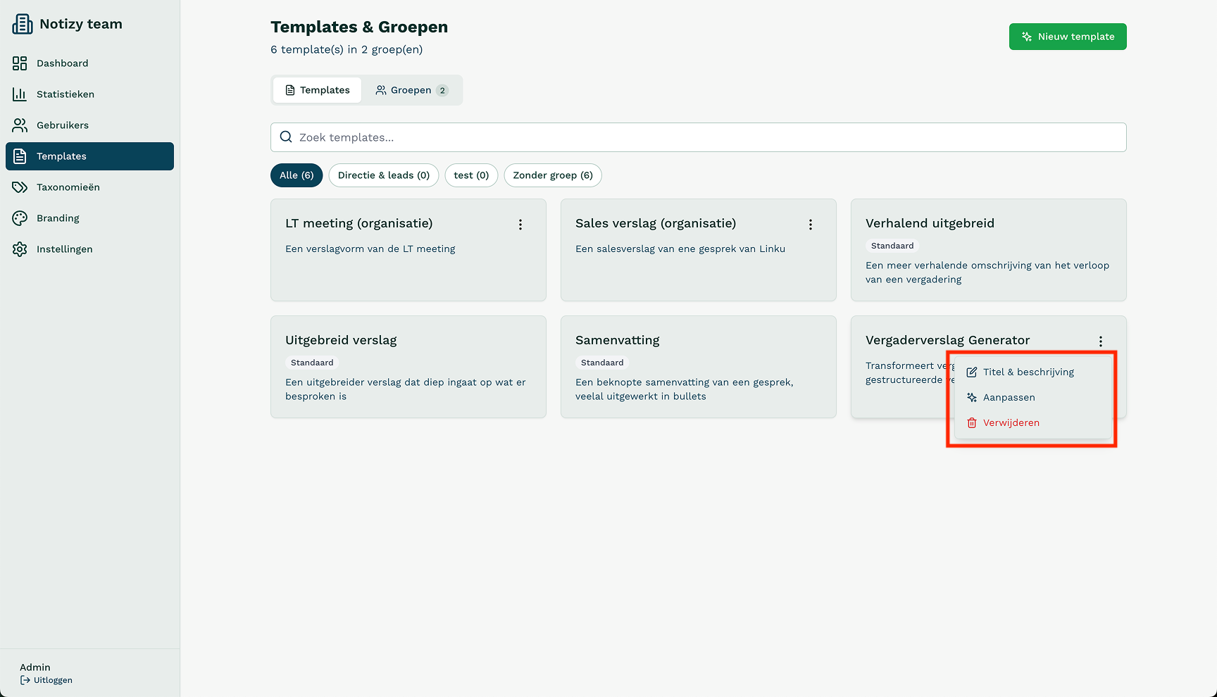 Zodra je zelfgemaakte templates in het overzicht hebt staan, kun je deze beheren via het context-menu (de drie bolletjes) op de template-kaart.