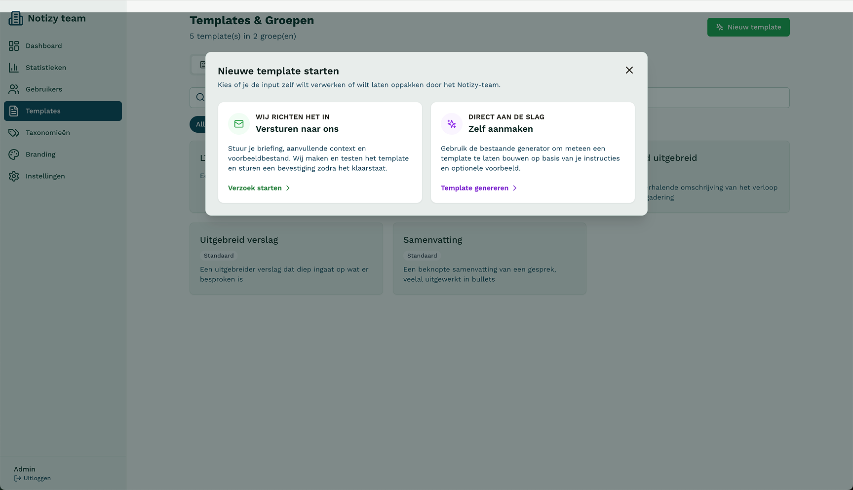 Het proces om een nieuwe manier van verslaglegging toe te voegen begint met de knop + Nieuw template rechtsboven op de overzichtspagina. Na het klikken op deze knop verschijnt er een pop-up venster waarin je een keuze moet maken over hoe het template tot stand komt.