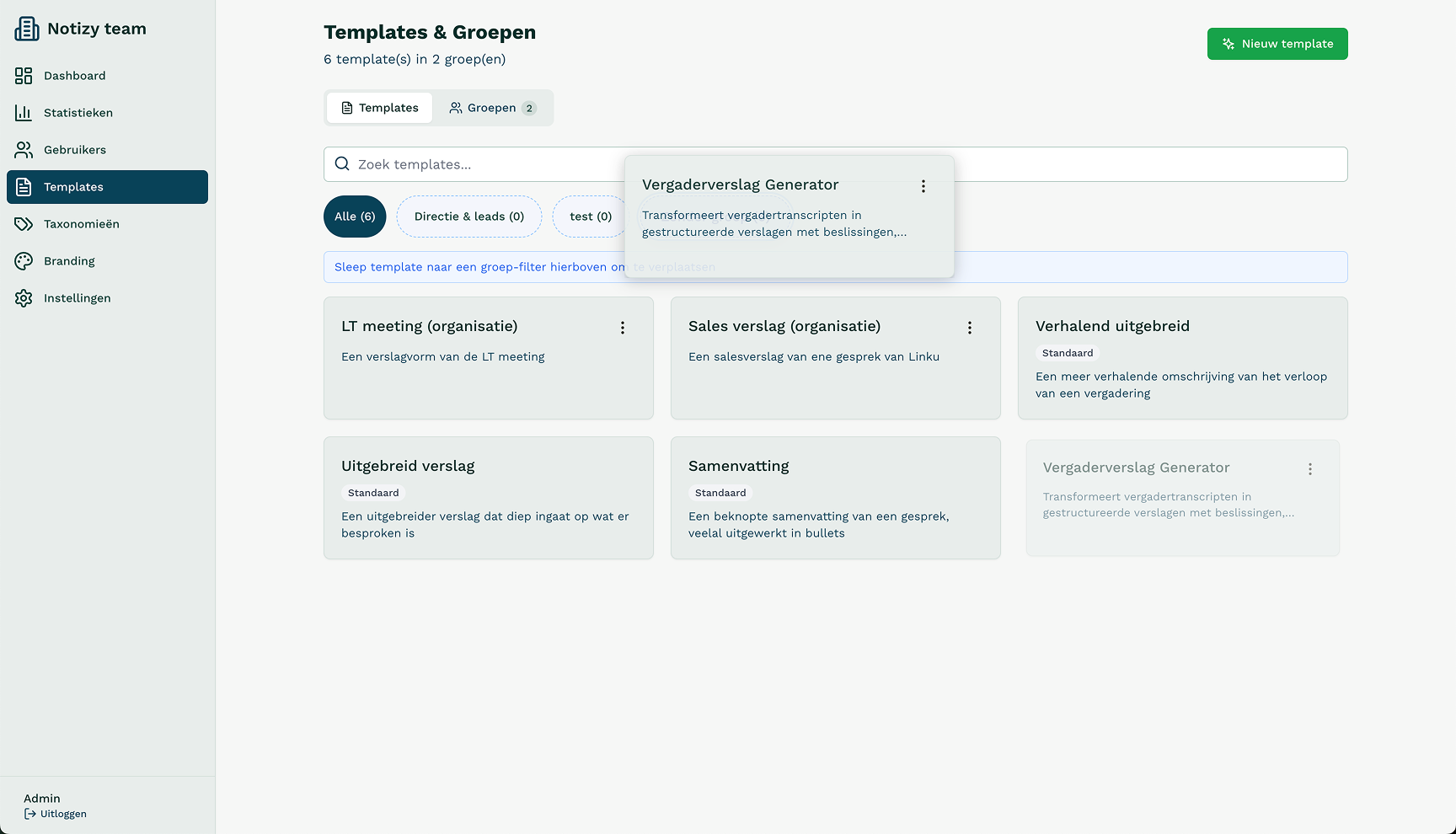 Door templates aan groepen te koppelen, zorg je ervoor dat teams alleen de voor hen relevante verslagvormen te zien krijgen. Een template kun je toewijzen aan een groep door deze te slepen naar een groep: