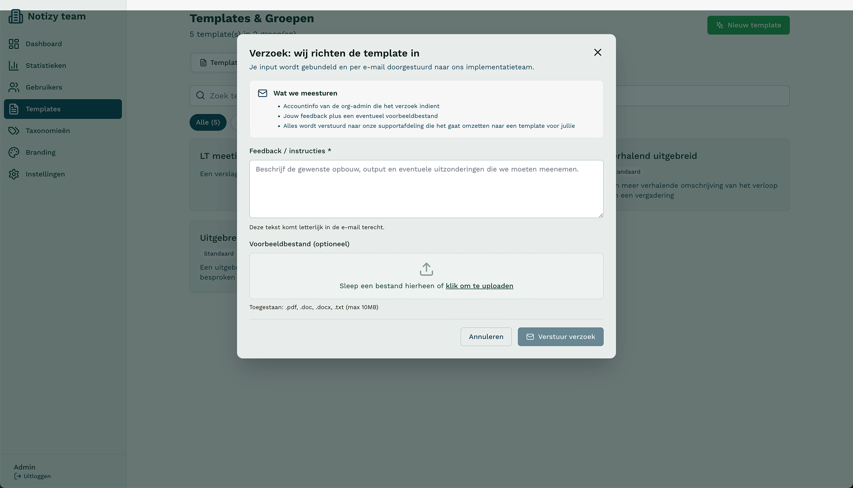Klik op Verstuur verzoek. Jouw instructies en het voorbeeldbestand worden gebundeld en naar het implementatieteam van Notizy gemaild. Wij nemen contact op zodra het template klaar staat.