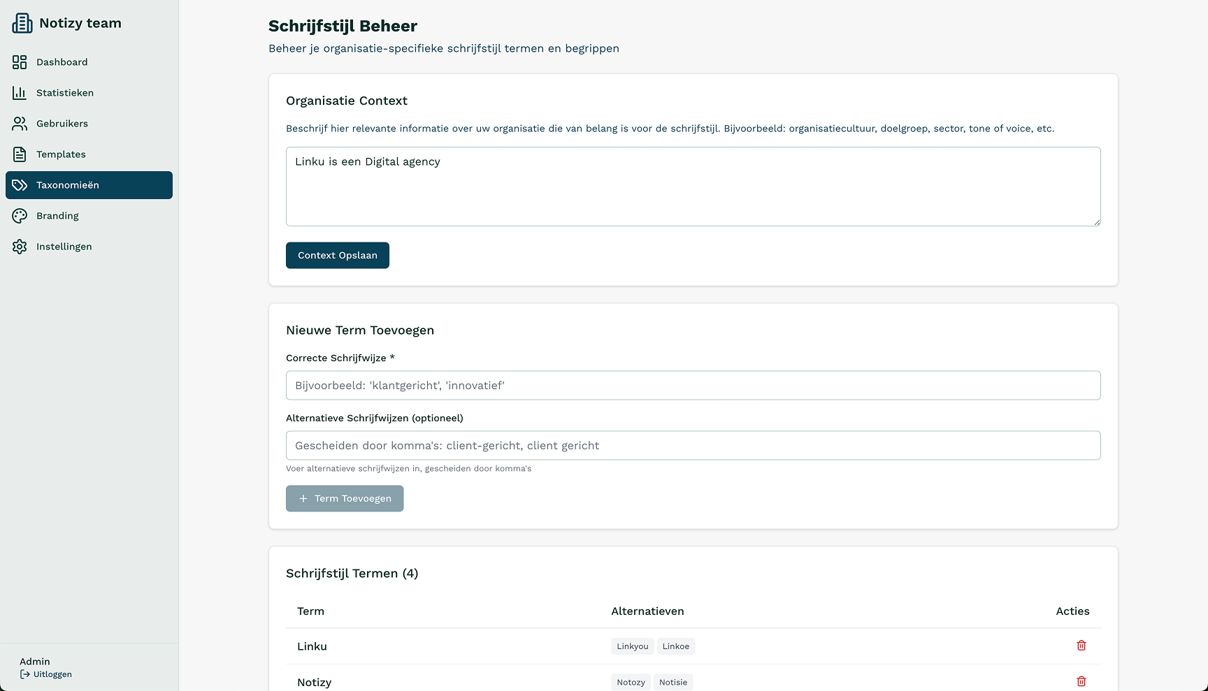 Om ervoor te zorgen dat verslagen en teksten perfect aansluiten bij de identiteit van jouw organisatie, kun je op de pagina Taxonomieën de schrijfstijl beheren. Hier leg je vast wie jullie zijn, voor wie jullie schrijven en welke specifieke termen er binnen de organisatie gebruikt worden.