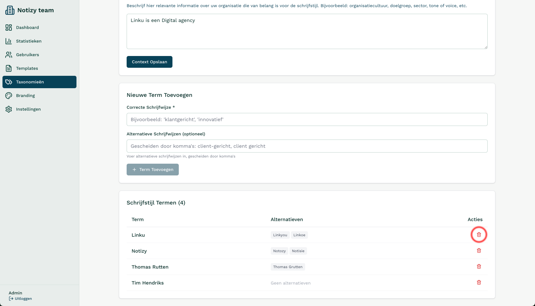Wil je een term niet langer gebruiken? Klik dan op het rode verwijdericoon (het prullenbakje) aan de rechterkant van de term.