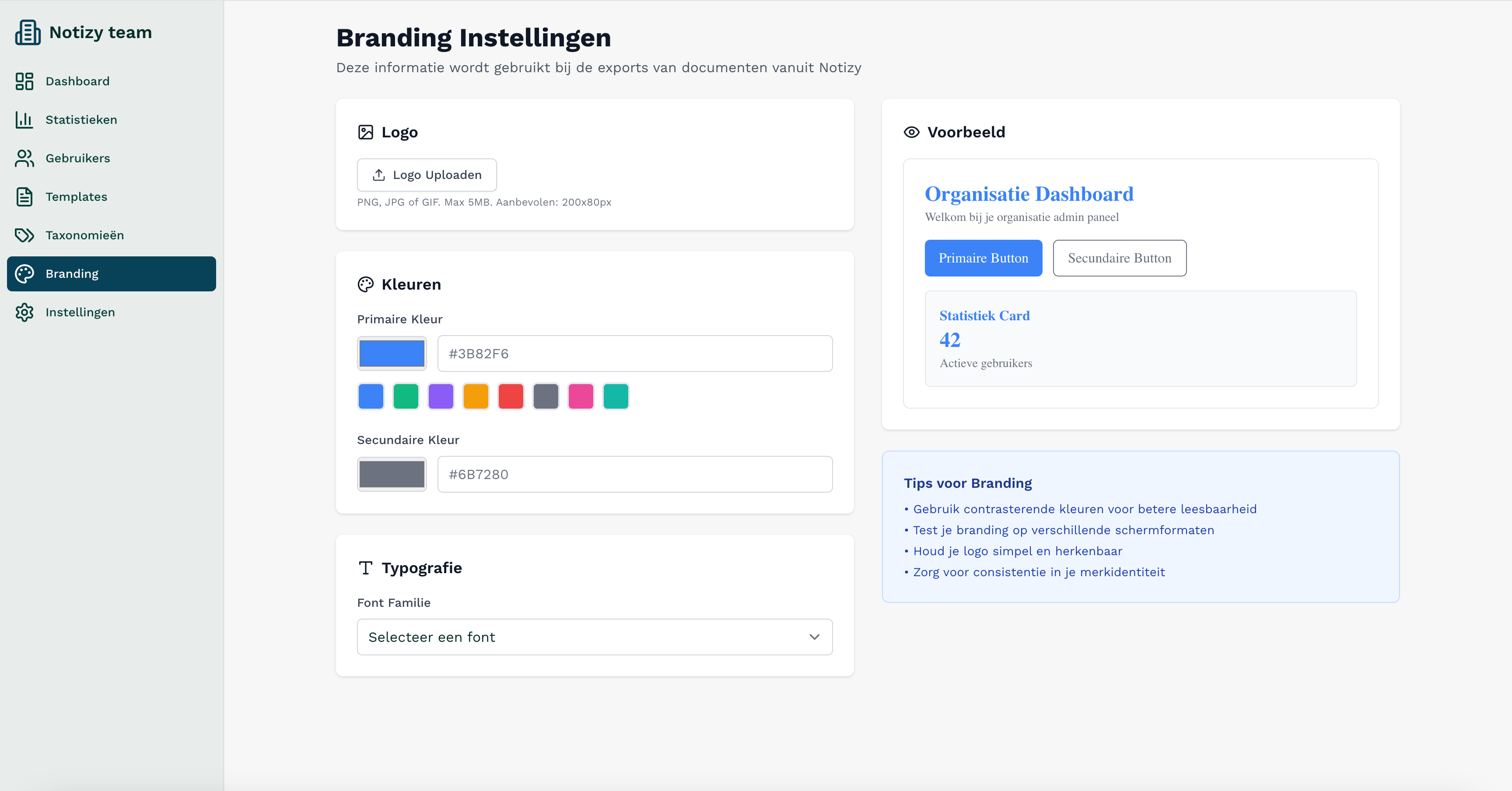 De branding instellingen bepalen de uitstraling van alle documenten die vanuit Notizy geëxporteerd worden. Door je eigen logo, kleuren en lettertypes in te stellen, zorg je ervoor dat elk verslag direct herkenbaar is als een officieel document van jouw organisatie.