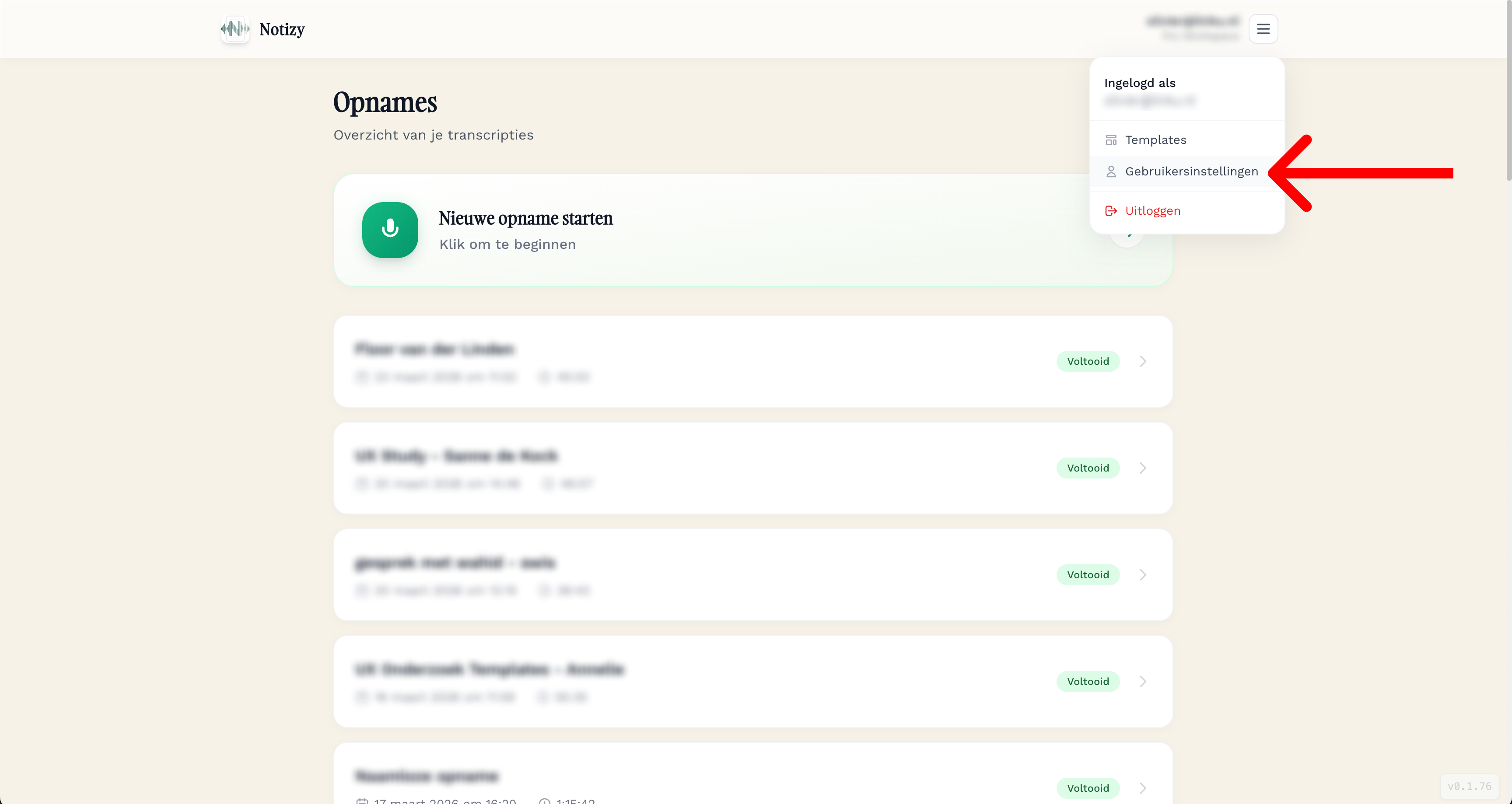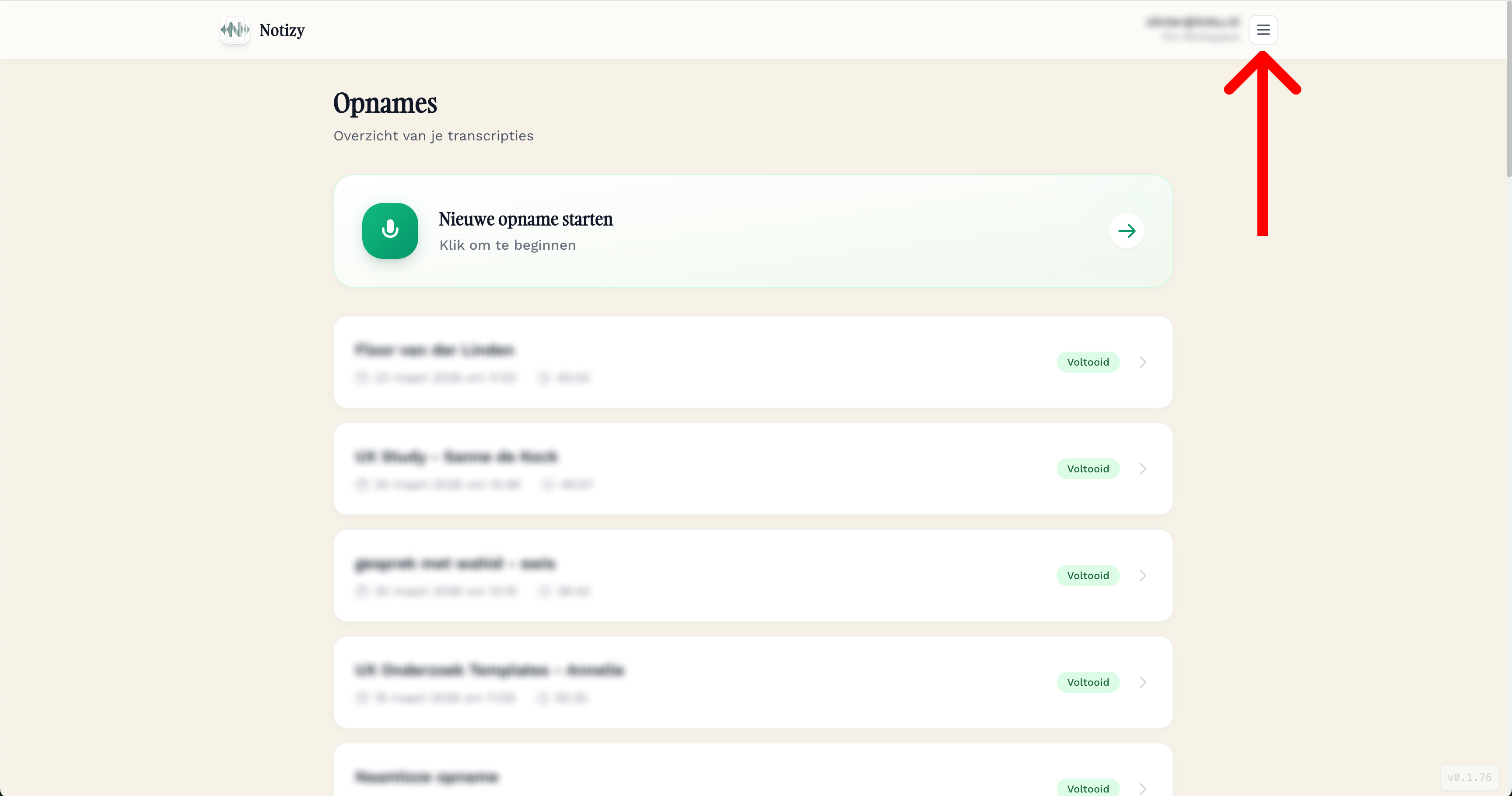 Open het menu Klik in het hoofdscherm (het dashboard met je opnames) op het menu-icoon rechtsboven in de hoek. Dit icoon ziet eruit als drie horizontale streepjes.