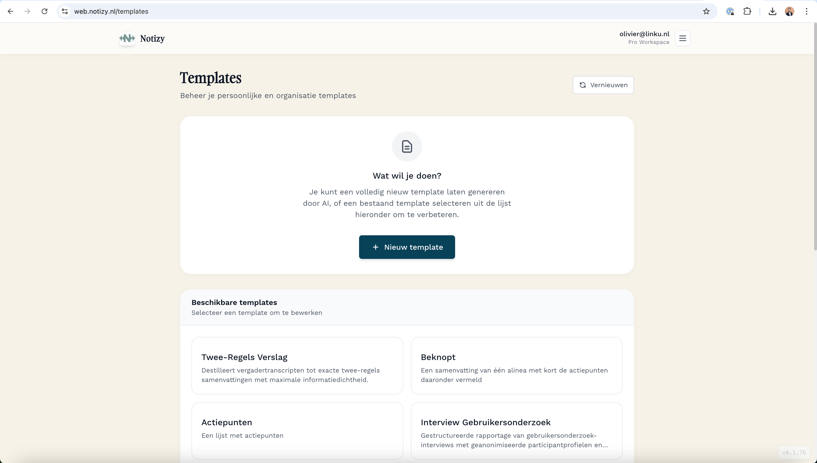 Omdat iedere werkwijze uniek is, biedt Notizy de mogelijkheid om maatwerk templates op te stellen. Hiermee bepaal je exact het format, het taalgebruik en de lay-out van je verslagen, zodat deze direct aansluiten bij jouw behoeften. Er zijn twee manieren om een nieuw template toe te voegen: