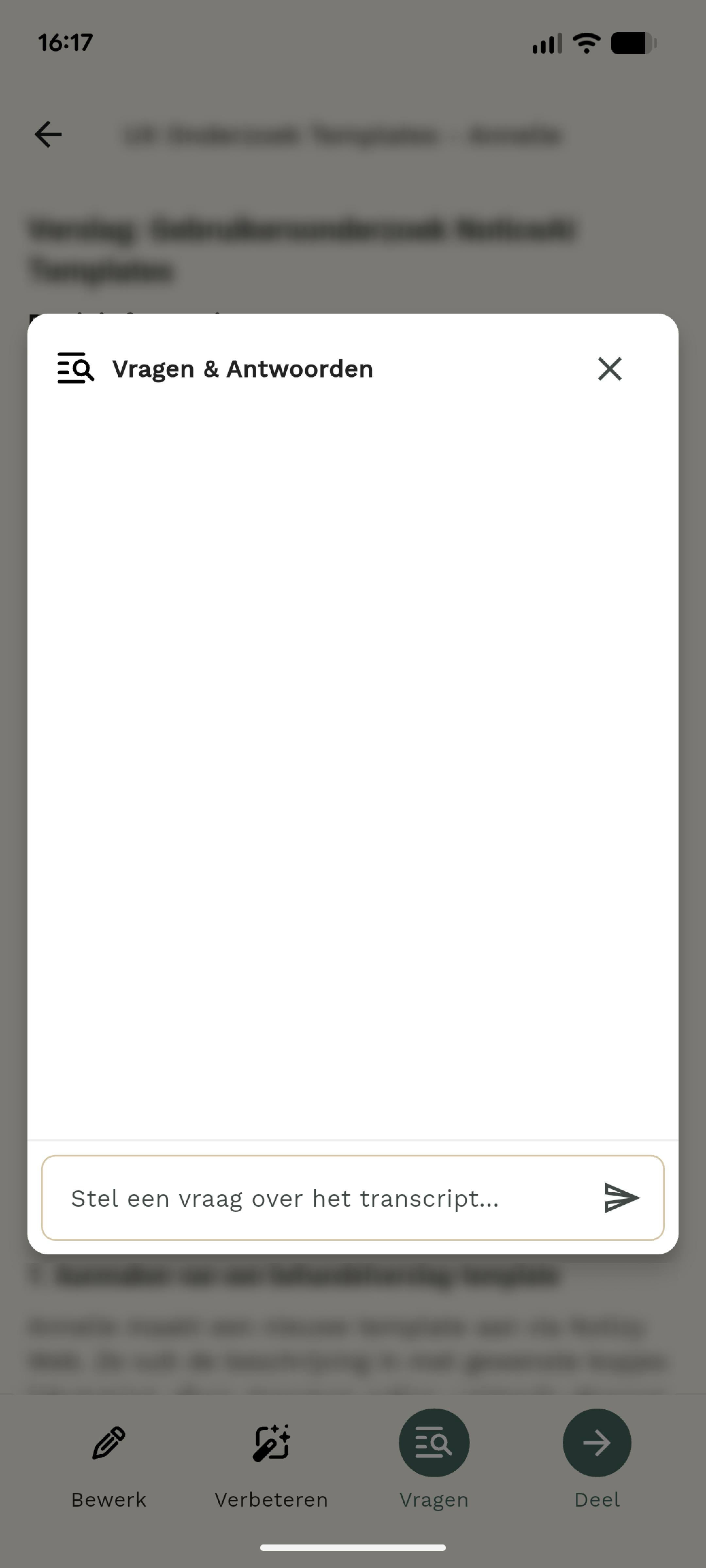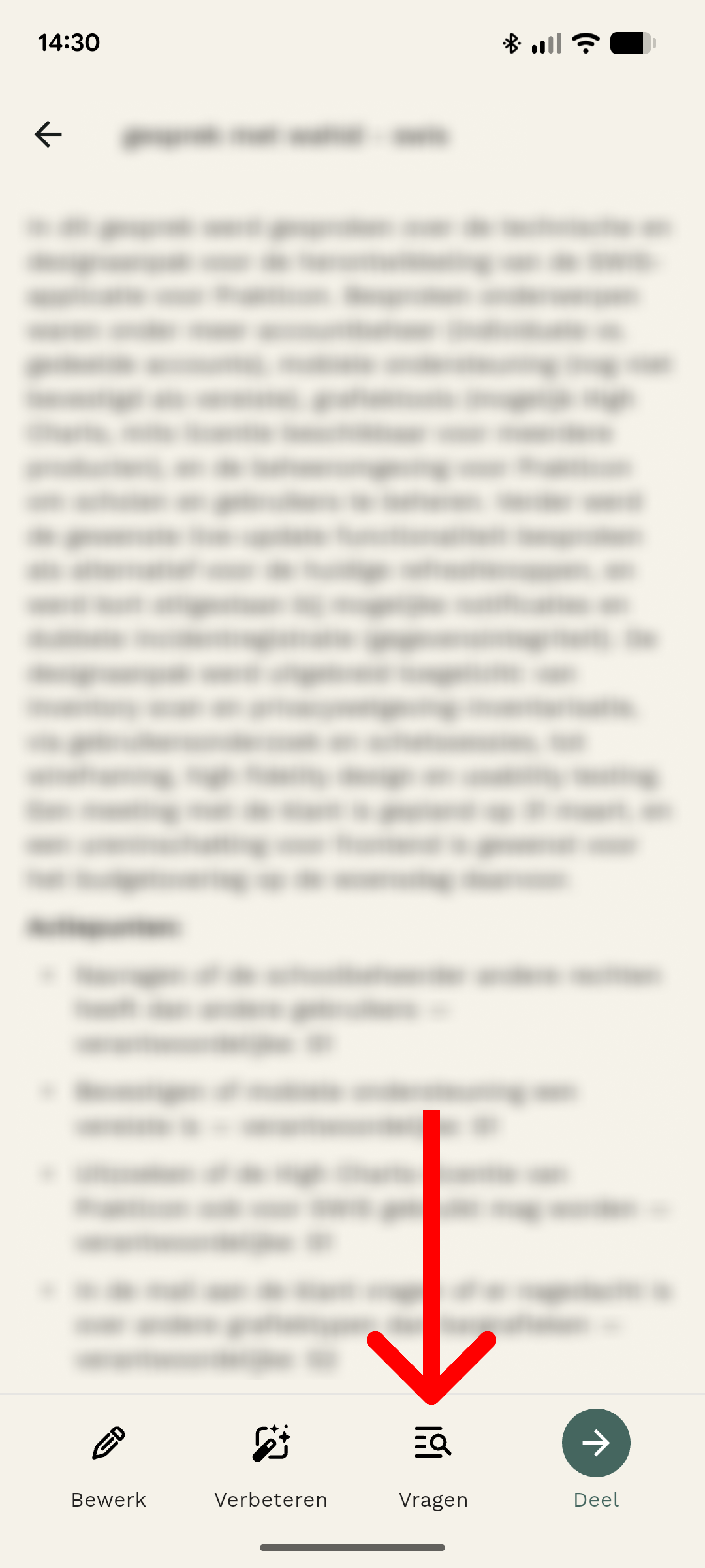 Wil je het gesprek of je werkwijze verbeteren? Dan kun je Notizy ook vragen om met je mee te denken. Bijvoorbeeld over wat er nog mist, hoe je dieper op een onderwerp had kunnen ingaan, of hoe je volgende gesprekken effectiever kunt voeren.