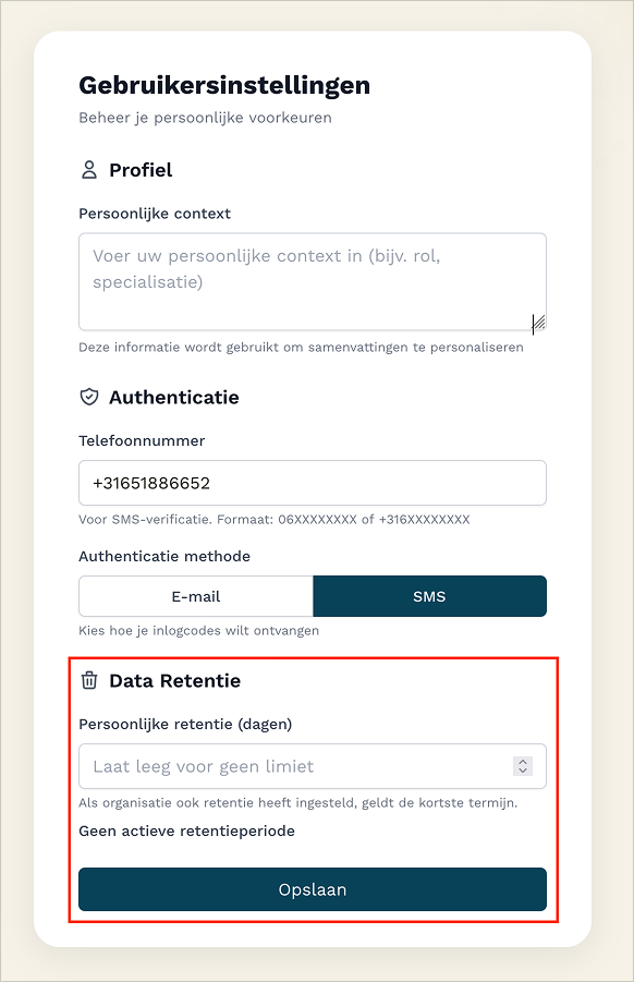Je data wordt voor 180 dagen bewaard. Je kan dit bij je gebruikersinstellingen wijzigen door het Data Retentie veld in te vullen.